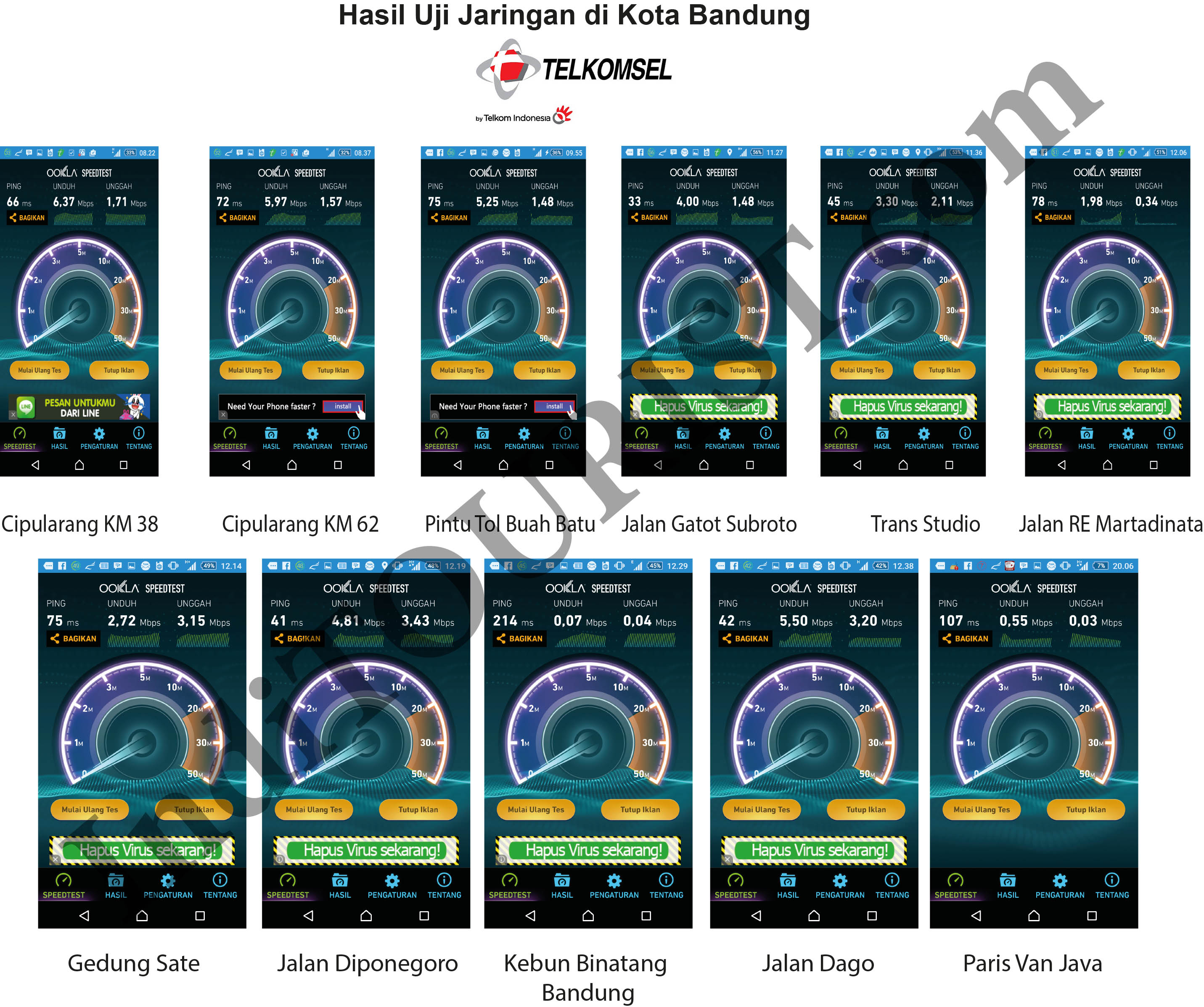 Beberapa titik uji lainnya di Kota Kembang ini pun tak begitu mengecewakan. Sebagai operator pertama yang mengkomersilkan layanan 4G di negeri ini, Telkomsel mampu mengcover hampir seluruh wilayah kota Bandung. Meski ada beberapa titik yang belum begitu maksimal kecepatannya. Namun secara umum hasil uji jaringan Telkomsel di kota ini tergolong baik. (sg)