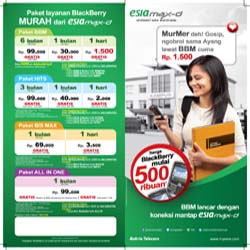 Menariknya lagi, Esia juga menyediakan layanan BB bulanan yang dilengkapi gratis telepon dan SMS sesama Esia sepuasnya (unlimited). Dinamakan paket BB All in One seharga Rp 99 ribu (termasuk pajak), Esia menyediakan akses data untuk kepentingan thetering, streaming youtube dll sebesar 1 GB