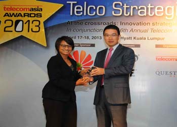 Dian Siswarini (kiri) menerima penghargaan dari TelecomAsia (DOK XL)