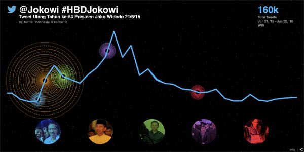 Dari 160,000 Tweet yang mention @jokowi, ada Tweet dari pengguna berpengaruh Indonesia, mulai artis hingga politisi. Beberapa di antaranya datang dari Wakil Presiden Jusuf Kalla (@Pak_JK), Gubernur Jakarta Basuki Tjahaja Purnama (@basuki_btp), Indra Bekti (@indrabektiasli) yang mengirim foto Tweet selfie dengan Presiden, serta Cinta Laura Kiehl (@xcintakiehlx) yang mengirim foto kue ulang tahun khusus untuk Jokowi.(pg)