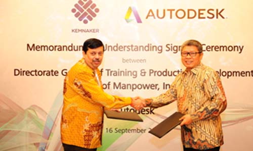 MOU antara Autodesk dan Kementerian Ketenagakerjaan ditandatangani pada pada acara tahunan Autodesk University Extension (Aux) ASEAN keempat di Jakarta oleh Kepala Pendidikan Asia Pasifik Autodesk, Deepankar Bhattacharyya dan Direktur Jenderal Pembinaan Pelatihan dan Produktivitas Kementerian Ketenagakerjaan, Khairul Anwar.
