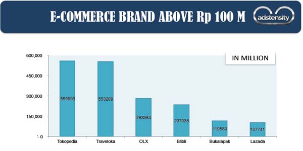Dalam rekaman adstensity, Tokopedia menghabiskan belanja iklan di televisi sekitar Rp 559 miliar, Traveloka (Rp 553,28 miliar), Olx (Rp 283,3 miliar), Blibli (Rp 237 miliar), Bukalapak (Rp 119,58 miliar).(id)