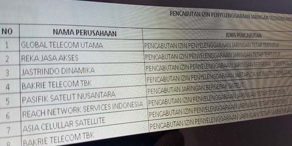 Sementara Jastrindo Dinamika dicabut izin penyelenggaraan jaringan bergerak teresterial radio trunking pada 26 September 2016. Pasifik Satelit Nusantara dicabut izin jaringan bergerak satelit pada 17 Oktober 2016. Reach Network Satellite dan Asia Cellular Satellite dicabut izin penyelenggaraan jaringan tetap tertutup pada 20 Oktober 2016. (
