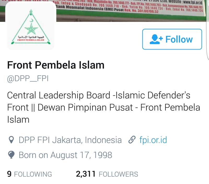 Kali ini yang diblokir akun dari organisasi yang memiliki massa lumayan banyak, yakni Front Pembela Islam (FPI) di platform Twitter. Dalam penelusuran ada tiga akun yang berelasi dengan FPI ditangguhkan oleh Twitter yakni @DPP_FPI, @HumasFPI, dan @syihabrizieq. Akun terakhir adalah milik Pemimpin Front Pembela Islam (FPI) Habib Rizieq Shihab.