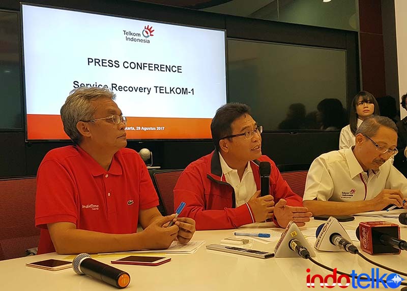 Direktur Utama Telkom Alex J Sinaga (tengah) didampingi Direktur Network & IT Solution Telkom Zulhelfi Abidin (kiri) dan Direktur Wholesale & International Service Abdus Somad Arief kala memberikan informasi seputar anomali satelit Telkom 1, Senin (28/8).(dok)