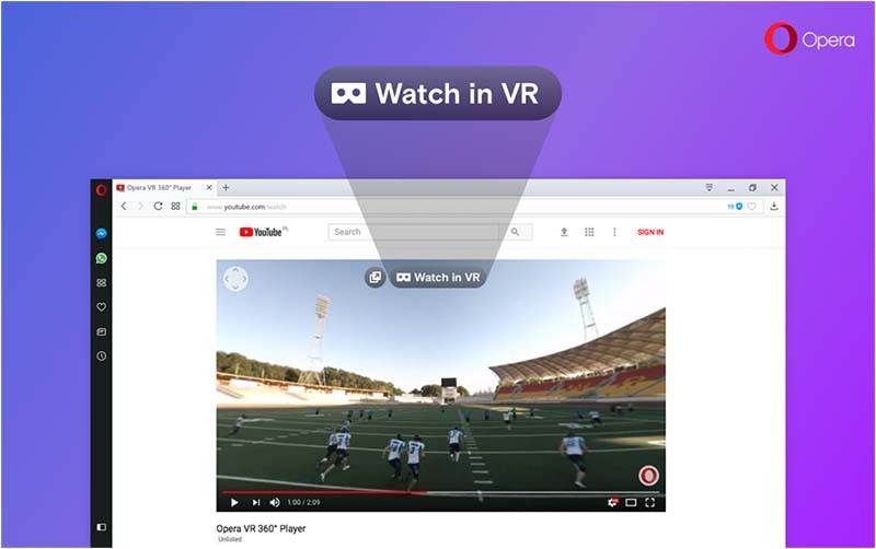 Saat pengguna sedang melihat video VR 360, tombol bertanda Watch in VR akan muncul tepat di atas video tersebut (di samping tombol pop out video Opera).