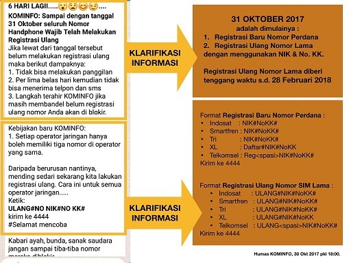 Andai pesan yang disampaikan "clear" ke masyarakat, bahwa registrasi baru Nomor Perdana dimulai 31 Oktober 2017, sedangkan untuk registrasi ulang pelanggan lama dimulai 31 Oktober 2017, dengan batas akhir tervalidasi pada 28 Februari 2018, tentunya kepanikan tak terjadi di masyarakat.