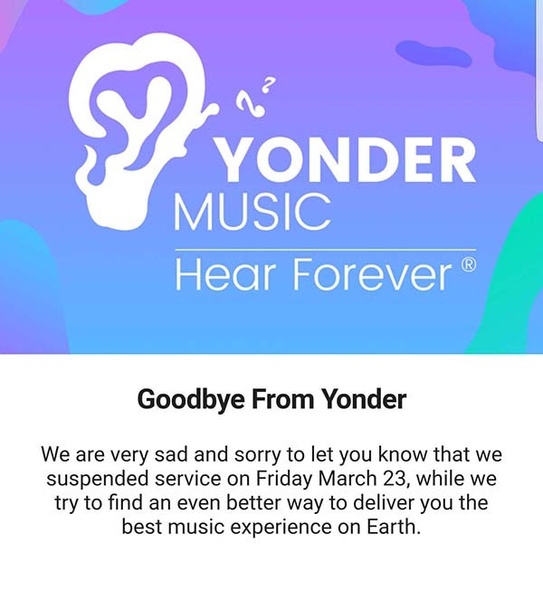 Dalam pengumuman Yonder meminta maaf harus melakukan suspensi terhadap layanan dan mengaku tengah mencari cara agar tetap bisa memberikan pengalaman mendengarkan musik ke pelanggannya.
