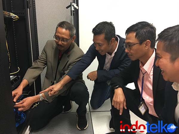 CMO Telin, Budi Satria Dharma Purba, CEO Telin, Faizal R. Djoemadi, CEO Carrier and International Business Telkom, Abdus Somad Arief, CEO Telin Hong Kong, Indarto Nata memeriksa kesiapan perangkat data center neuCentrIX HK-1 di Hong Kong, Kamis (12/4).(ist)