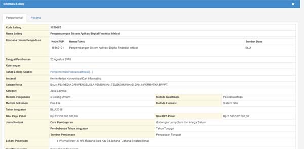 Dikutip dari LPSE milik Kominfo, saat ini tahapan lelang telah menyelesaikan evaluasi dokumen kualifikasi dari 32 peserta yang memperebutkan kemenangan dari nilai tender dengan nilai pagu sebesar Rp23,5 miliar. Sedangkan Harga Perkiraan Sendiri (HPS) sekitar Rp3,586 miliar.