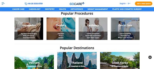 Dengan menggandeng lebih dari 320 klinik dan rumah sakit, GO.CARE yakin para pasien dapat memperoleh layanan kesehatan yang diinginkan di negara-negara tujuan berobat, seperti Thailand, Malaysia, Vietnam, Singapura, India, dan Korea Selatan. Prosedur medis yang ditawarkan pun bervariasi, mulai dari yang populer, seperti pengobatan gigi, operasi plastik, kardiologi (jantung), onkologi (kanker), hingga ratusan prosedur lainnya.(wn)