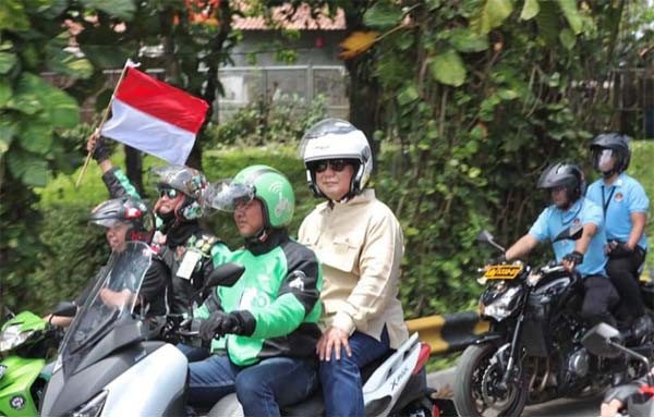 Prabowo memenuhi undangan "Babang Ojol" yang tergabung dalam Forum Gabungan (Forgab) Roda 02 dengan dibonceng oleh salah satu pengendara Ojol.