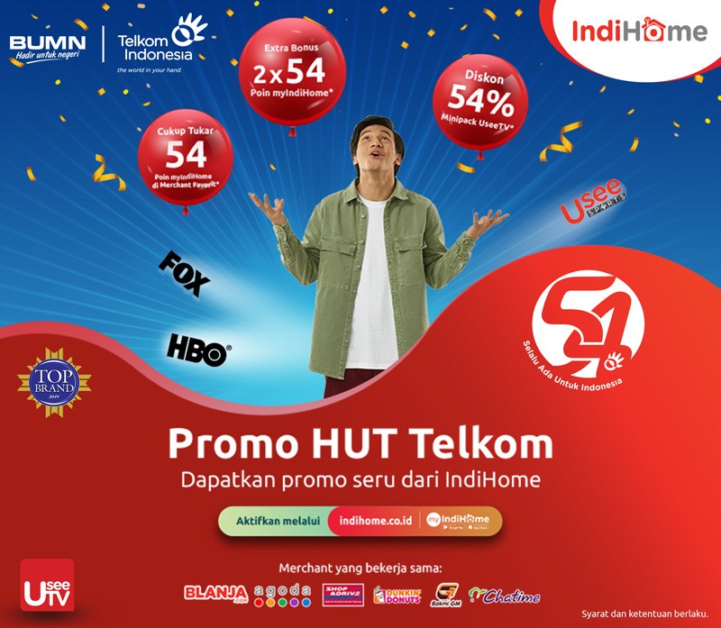 JAKARTA (IndoTelko) - PT Telekomunikasi Indonesia Tbk (Telkom) menghadirkan rangkaian promo menarik untuk pelanggan baru dan pelanggan lama yang sudah berlangganan layanan IndiHome dalam rangka memperingati HUT Telkom yang ke-54.