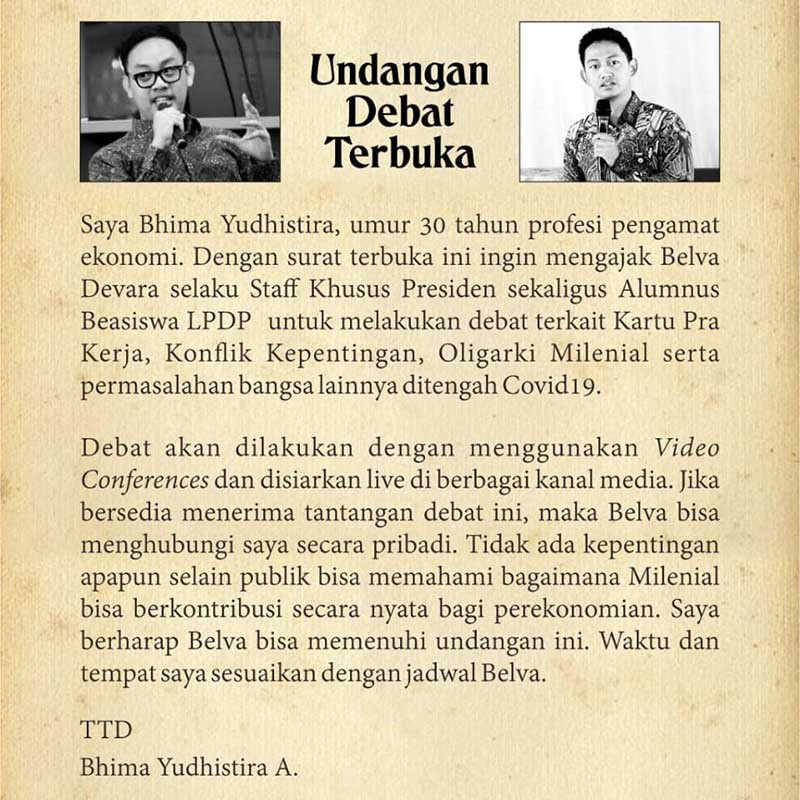 Di akun Facebook-nya Bhima menuliskan, "Milenial adalah generasi yang diharapkan membawa perubahan, berani melawan arus, tidak berada dalam lingkungan oligarki. Oleh karena itu publik ingin melihat gagasan apa yang bisa ditawarkan Milenial ditengah pandemi. Ini undangan debat terbuka sesama Milenial, dalam rangka membangun kesadaran intelektual. Saya berharap kawan @belvadevara bisa memenuhi undangan ini".