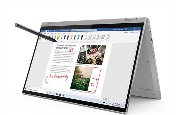 Para pengguna memiliki beberapa pilihan mode yang dapat digunakan termasuk mode 'Laptop' untuk komputasi sehari-hari, mode 'Tent' untuk membagikan dokumen, mode 'Stand' untuk menonton, atau mode 'Tablet' untuk menggambar. Untuk memastikan proses berkarya tidak akan terhenti, daya tahan baterai IdeaPad Flex 5 dibuat agar tahan lama dengan menawarkan hingga 10 jam penggunaan untuk video playback FHD 1080P. Fitur Rapid Charge juga memungkinkan Anda untuk mengisi daya perangkat Anda hingga 80% hanya dalam waktu satu jam saja.