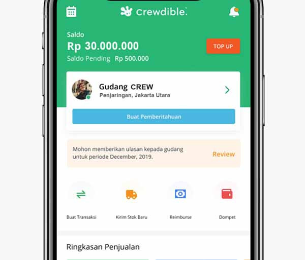Halaman utama (dashboard) aplikasi Crewdible kini telah diperbaharui dengan tampilan yang lebih ringkas dan informatif bagi seller. Beberapa informasi yang ditampilkan dalam dashboard meliputi ringkasan penjualan, grafik produktivitas serta rangkuman penjualan terbaik.