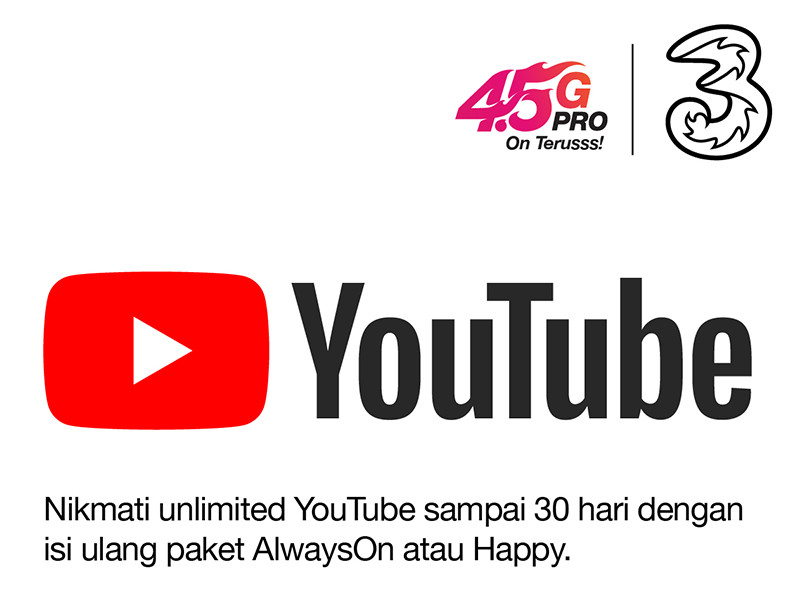 Baru-baru ini 3 Indonesia memberikan tambahan kuota unlimited YouTube bagi para pengguna barunya dengan masa berlangganan kurang dari 90 hari, dan melakukan isi ulang paket AlwaysOn maupun Kuota Happy.
