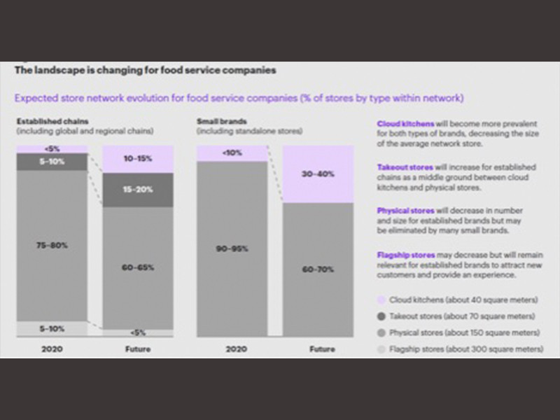 Shirley menambahkan, restoran berantai perlu beralih ke model hybrid network atau jaringan hibrida yang menggabungkan toko fisik yang lebih kecil, cloud-kitchen dan outlet khusus untuk takeaway. "Kehadiran restoran flagship akan tetap relevan untuk membangun kehadiran brand, tetapi ukuran akan lebih kecil 15 persen karena berkurangnya pelanggan yang makan di tempat. 30 persen portofolio perusahaan juga akan dialokasikan untuk cloud-kitchen,” katanya.