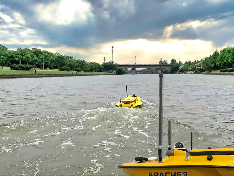Kita bisa melakukan survei dari jarak jauh dengan remote control, dari tepi sungai atau danau. Apache 3 dapat bekerja secara otomatis hingga rentang jangkauan 2 Km untuk mengirim data kedalaman di bawah permukaan air.