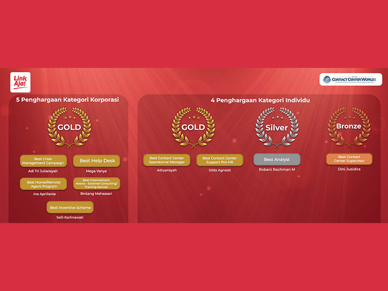 Tak tanggung-tanggung, perusahaan ini berhasil menorehkan prestasi dengan meraih sembilan penghargaan dan meraih predikat Gold untuk kategori Korporasi sebagai Best Crisis Management Campaign, Best Help Desk, Best Home/ Remote Agent Program, Best Improvement Award – External Consulting/ Training Service dan Best Incentive Scheme. Sedangkan untuk kategori Individu, LinkAja berhasil meraih predikat Gold sebagai Best Contact Center Operational Manager serta Best Contact Center Support Pro-HR. Bukan hanya itu, LinkAja pun meraih predikat Silver pada kategori Best Analyst dan predikat Bronze pada kategori Best Contact Center Supervisor.