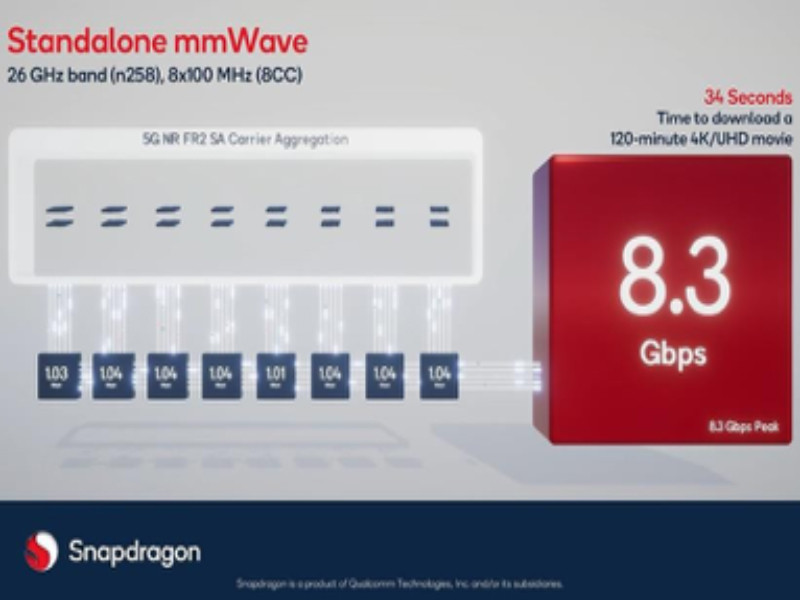 Koneksi 5G standalone mmWave pertama di dunia, dengan kecepatan puncak lebih dari 8Gbps yang dicapai menggunakan Keysight’s 5G Protocol R&D Toolset dengan perangkat uji 5G yang ditenagai oleh Snapdragon X70. Pencapaian tersebut dilakukan pada Laboratorium 5G Integration and Test milik Qualcomm Technologies di San Diego.