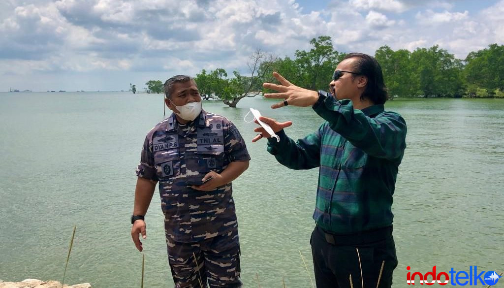 Asisten Khusus Menteri Kelautan dan Perikanan Bidang Media dan Komunikasi Publik Doni Ismanto Darwin (kanan) bersama Asisten Operasi Survei dan Pemetaan – Pushidrosal Laksamana Pertama TNI Dyan Primana Sobaruddin saat meninjau lokasi penempatan kabel bawah laut di Tanjung Pinggir, Batam, Jumat (29/7).