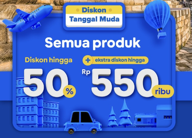 Tiket.com mengajak sobat tiket dapat menikmati promo Diskon Tanggal Muda (DTM) hingga 50% + ekstra diskon hingga Rp550.000 untuk semua produk mulai dari tiket pesawat, hotel, kereta api, To Do, event, sewa mobil, yang berlangsung dari tanggal 25 Januari hingga 3 Februari 2023.