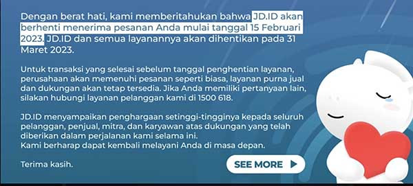 "Dengan sangat menyesal kami mengumumkan JD.ID akan berhenti menerima pesanan mulai 15 Februari 2023 dan seluruh servis akan dihentikan efektif mulai 31 Maret 2023," tulis pengumuman itu.