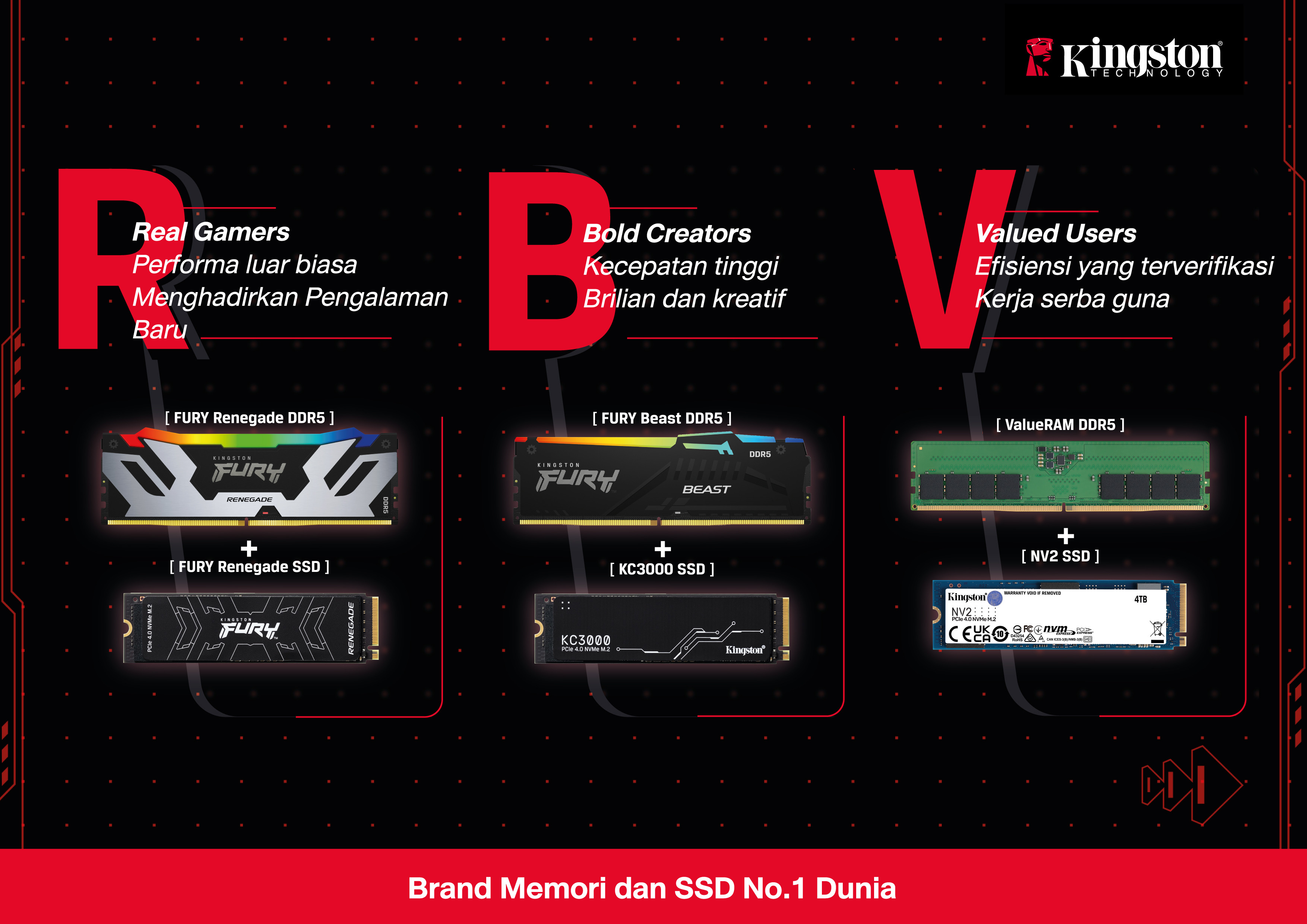 Untuk meningkatkan pengalaman para penggemar game, konten kreator, pengguna sehari-hari, dan semua pengguna lainnya, Kingston secara khusus mengurasi kombinasi produk memori dan SSD RBV yang menjamin kompatibilitas dan memberikan performa terbaik di kelasnya.