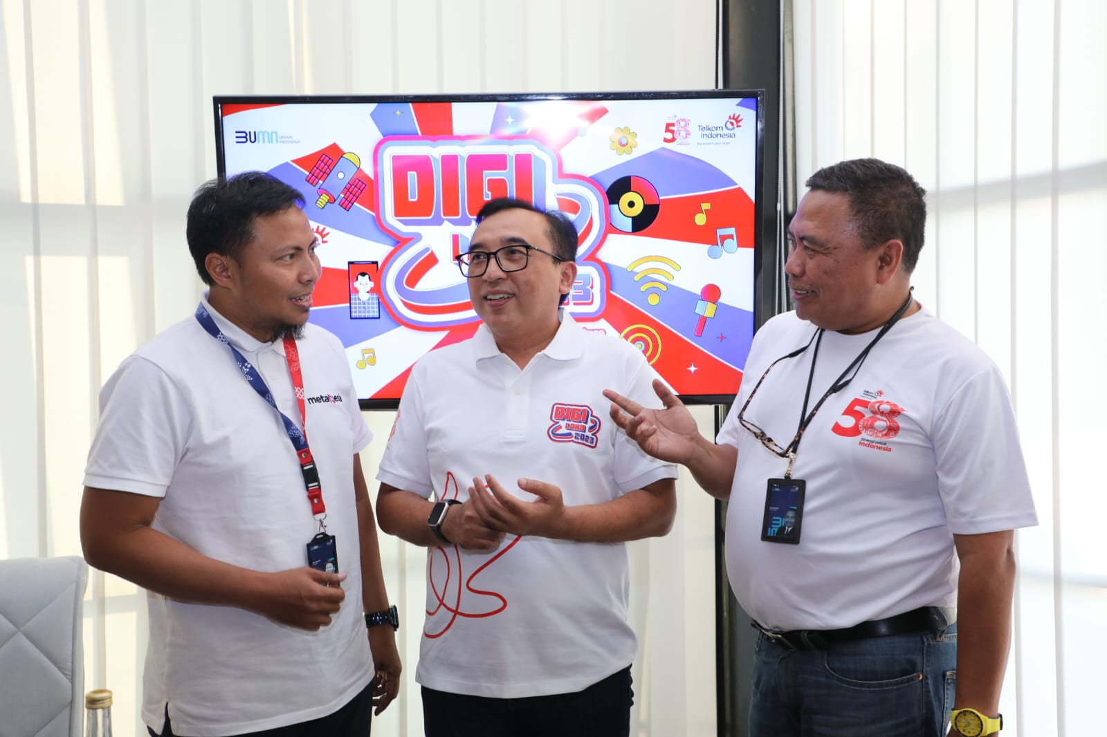 VP Corporate Communication Telkom Andri Herawan Sasoko (tengah) bersama GM Witel Surabaya Selatan Deny Aryanto (kiri) dan AVP External Communication Telkom Sabri Rasyid (kanan) saat konferensi pers Digiland 2023 Surabaya, Kamis (20/7).