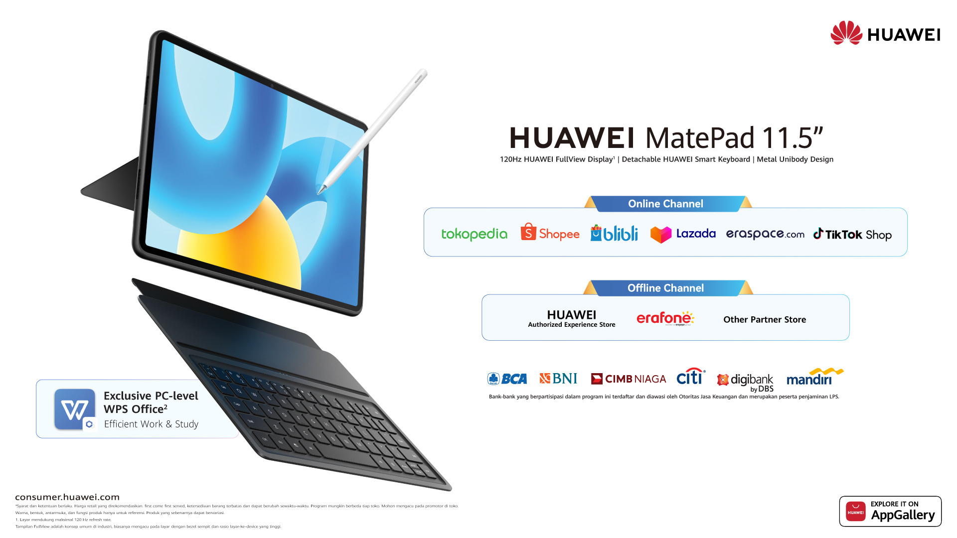 Anda juga bisa memilih pembayaran lewat cicilan 0% melalui Spaylater hingga 5 bulan (Rp 916,500/bulan), sehingga membuat Huawei MatePad 11.5 makin terjangkau. Sementara untuk pembelian offline, Anda dapat mengunjungi Huawei Authorized Experience Store atau Erafone terdekat, dimana terdapat promo trade-in juga untuk meningkatkan aksesibilitas Huawei MatePad 11.5 ini.