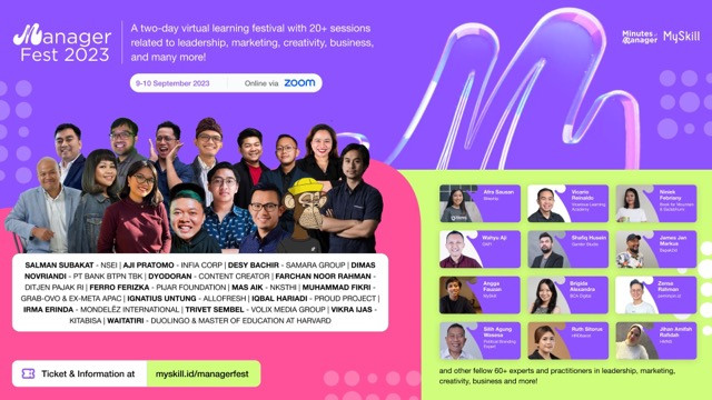 Manager Fest 2023 dijadwalkan akan berlangsung pada 9-10 September 2023 secara daring, sebagai sebuah langkah revolusioner dalam memajukan pembelajaran virtual. Dengan lebih dari 20 kelas yang diisi oleh lebih dari 60 praktisi berpengalaman dari berbagai industri di Indonesia, festival ini mengeksplorasi beragam topik yang mencakup kepemimpinan, pemasaran, strategi bisnis, kreativitas, dan masih banyak lagi.