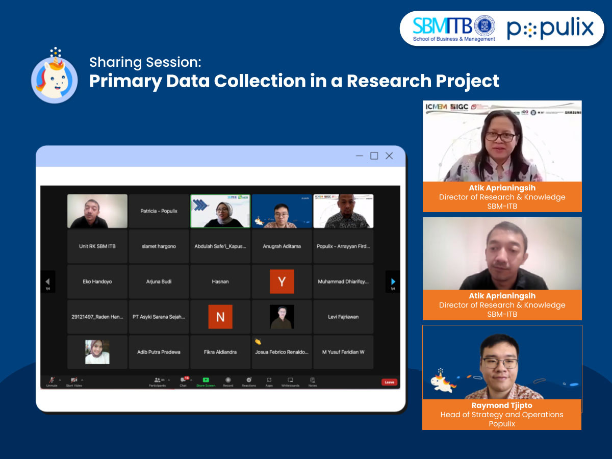Dalam sambutannya pada acara Sharing Session SBM-ITB dan Populix: Primary Data Collection in a Research Project, Director of Research & Knowledge, SBM-ITB, Atik Aprianingsih mengatakan, proses pengumpulan data kerap kali menjadi tantangan tersendiri bagi para peneliti. Padahal, tingkat validitas dan realibilitas data menjadi kunci dari kualitas data yang disajikan.