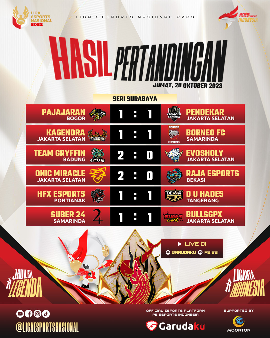 JAKARTA (IndoTelko) - Liga 1 Esports Nasional seri Surabaya yang digelar di Galaxy Mall 20-22 Oktober 2023, resmi selesai. Secara mengejutkan Pajajaran Esports Bogor mendapatkan posisi puncak di klasemen sementara setelah bermain sangat apik di 3 hari di kota Pahlawan. Setelah ini Liga 1 Esports Nasional akan memainkan seri terakhirnya di Makassar.