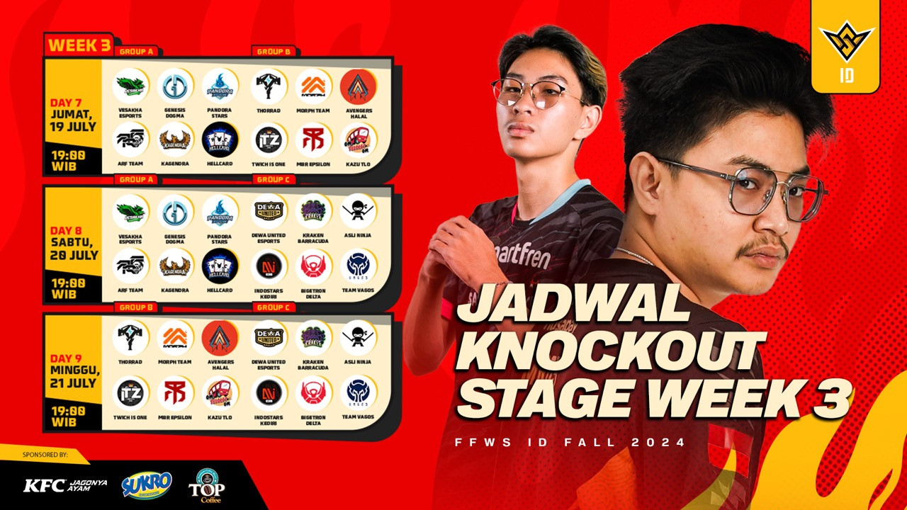 FFWS ID 2024 Fall akan segera memasuki Week 3 sekaligus pekan terakhir untuk Knockout Stage. Tim yang mampu finis di posisi 12 besar dari babak ini akan lolos ke babak Point Rush dan Grand Finals yang akan diselenggarakan di Sabuga, Bandung pada 27-28 Juli 2024. Pemenang dari FFWS ID 2024 Fall akan mendapatkan 1 kursi untuk bergabung bersama 4 tim lainnya sebagai wakili Indonesia di FFWS SEA 2024 Fall.