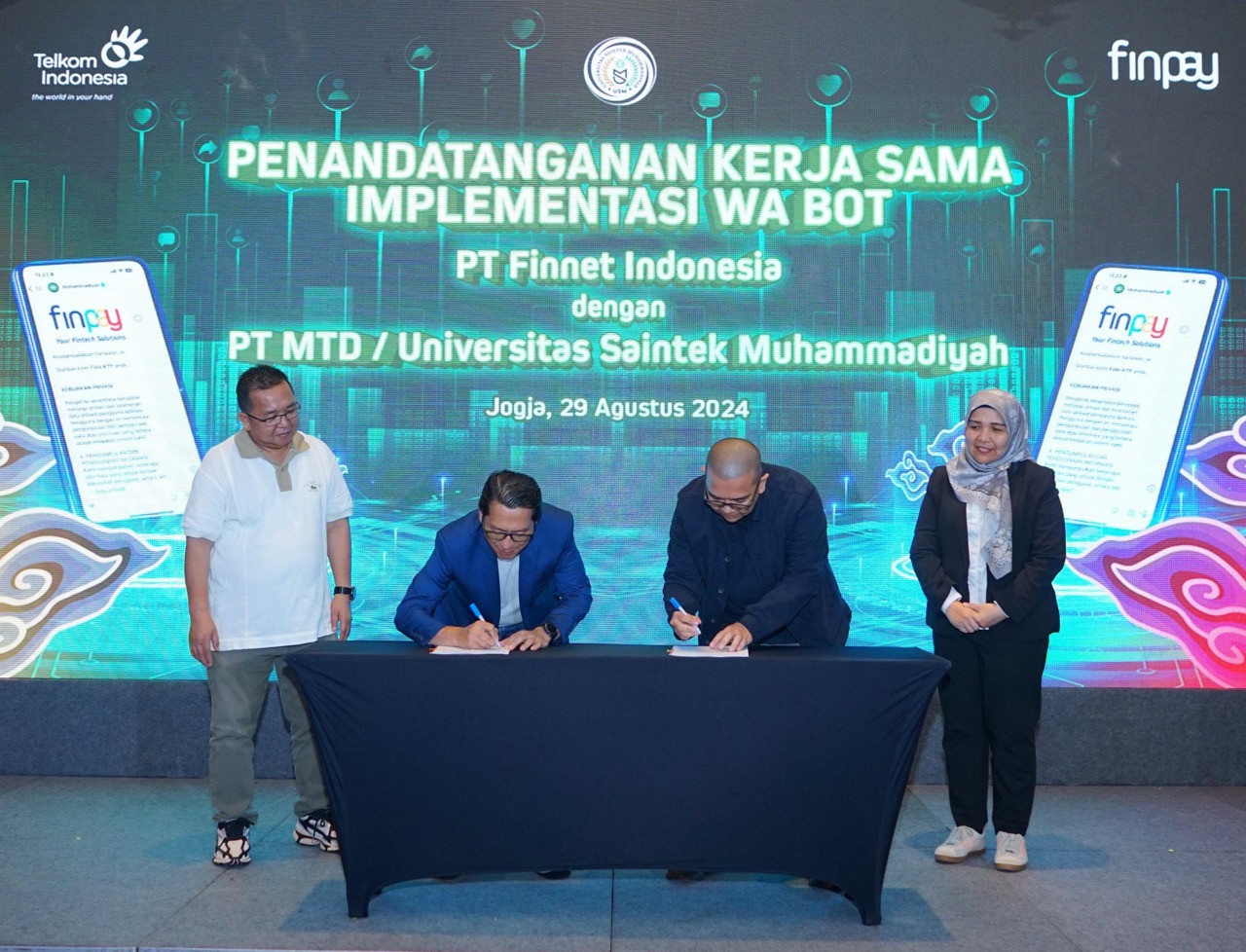 JAKARTA (IndoTelko) - PT Finnet Indonesia (Finnet) sebagai salah satu anak usaha PT Telkom Indonesia (Persero) Tbk (Telkom) yang bergerak di bidang payment gateway, melakukan penandatanganan perjanjian kerja sama solusi WhatsApp Bot untuk komunitas Muhammadiyah bersama PT Mentari Teradaya Digital (MTD). Penandatanganan ini berlangsung di sela-sela kegiatan kunjungan Finnet ke Telkom Regional III di Hotel Artotel Suites. Penandatanganan dilakukan oleh Direktur Enterprise Business Finnet Aziz Sidqi dan Direktur MTD Bambang Priambodo, turut disaksikan Badan Pembina Harian Saintek Muhammadiyah Indonesia Husni Anriyanto dan EVP Telkom Regional III Fera Pebrayenti.