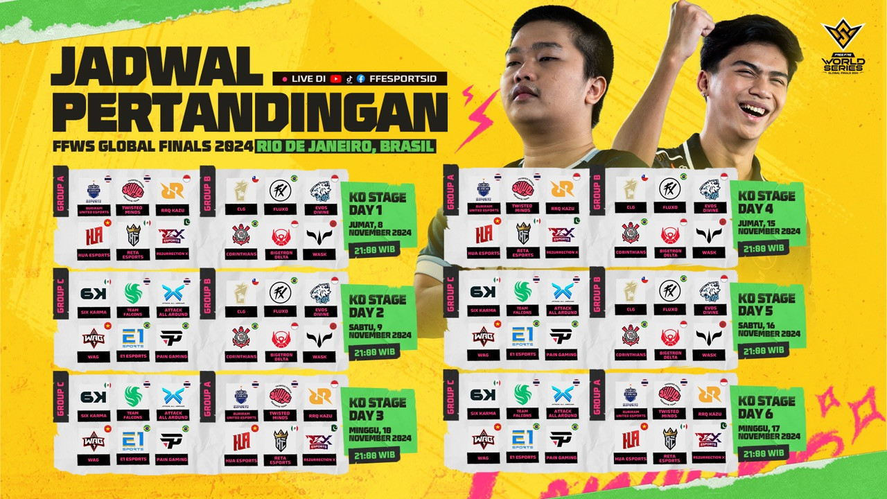 Pertarungan tiga tim Indonesia akan dimulai di Knockout Stage FFWS Global Finals mulai akhir pekan ini, 8-10 November 2024. Babak ini akan berlangsung setiap Jumat, Sabtu, dan Minggu hingga 17 November 2024. Setiap tim akan bertanding dalam 4 matchday dari 6 matchday di sepanjang 2 pekan tersebut untuk mengamankan peringkat 12 besar agar bisa lolos ke babak Point Rush dan Grand Finals dan memperebutkan total hadiah senilai US$1 juta. (mas)